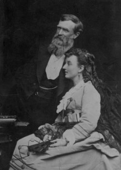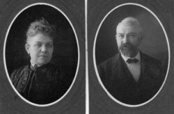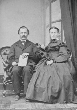 This is a photograph of Mr. and Mrs. John Barry. John came to Muscatine in 1847. He was born near Dayton, Ohio November 18, 1840 and died March 9, 1922. He was a Civil War veteran. Their marriage occurred May 3, 1871. Mrs. Barry was the former Miss Mary Frances Nisly. She was born June 29, 1851 and died April 19, 1923. Her parents were Mr. and Mrs. J.R. Nisly.