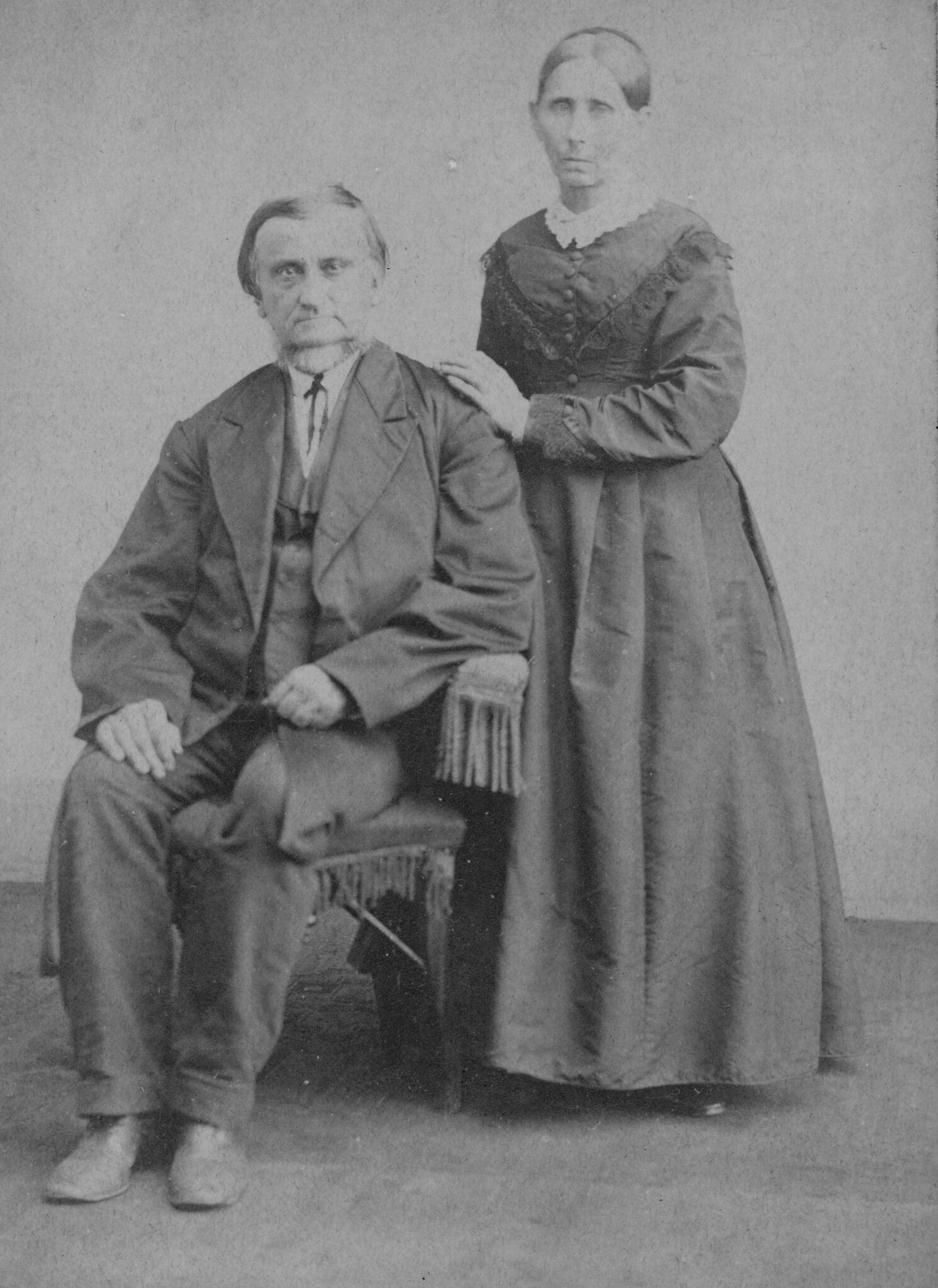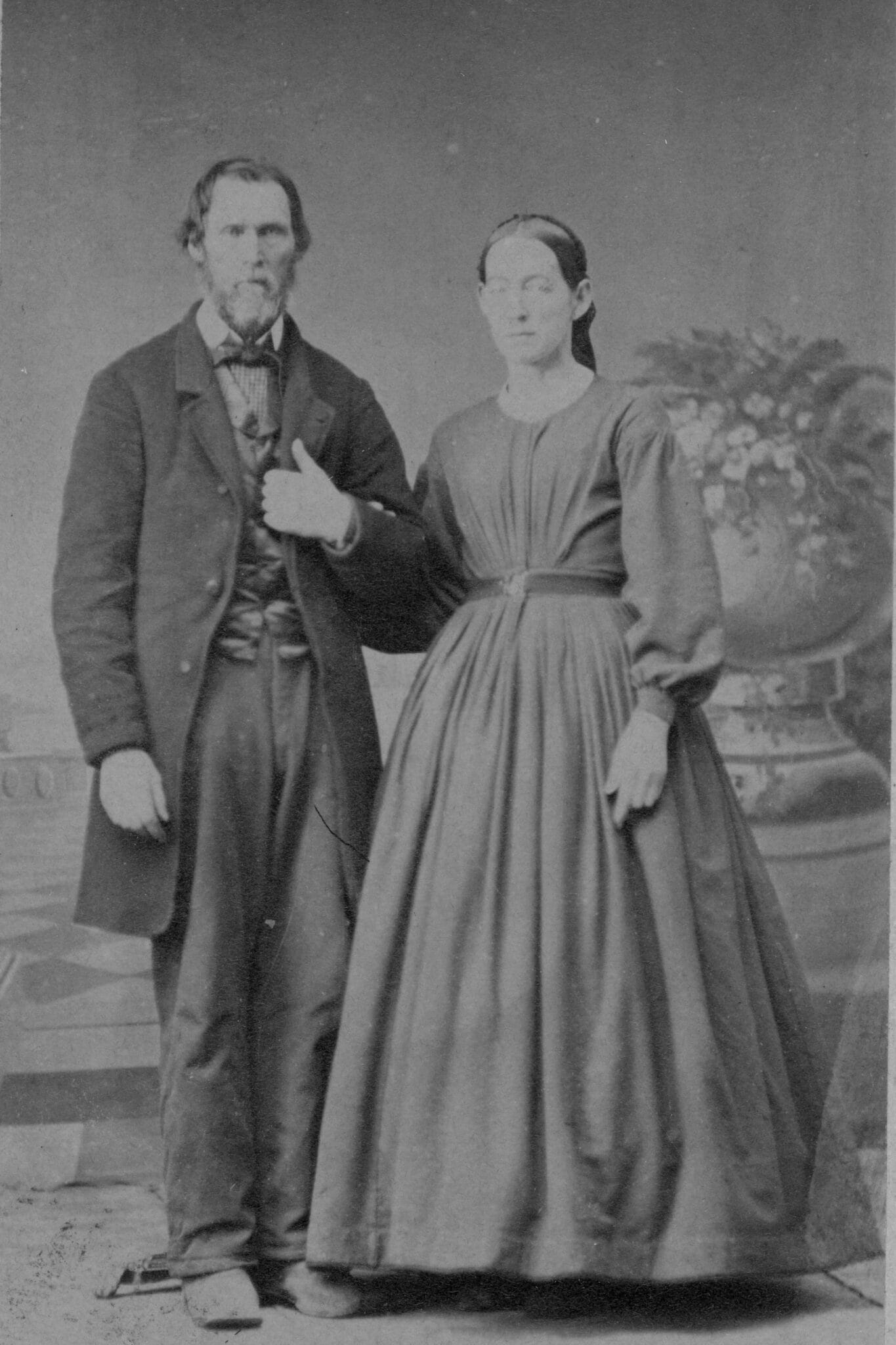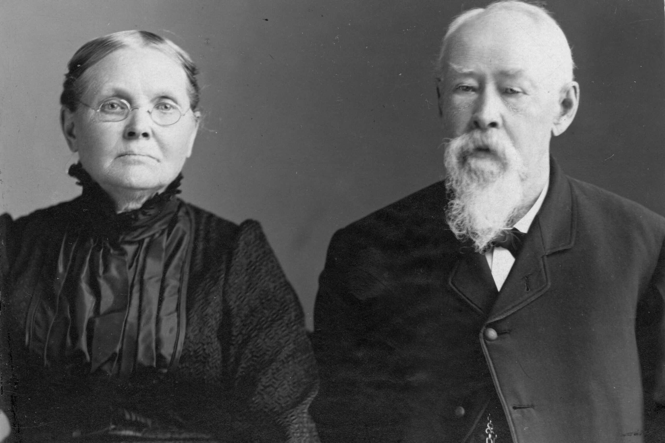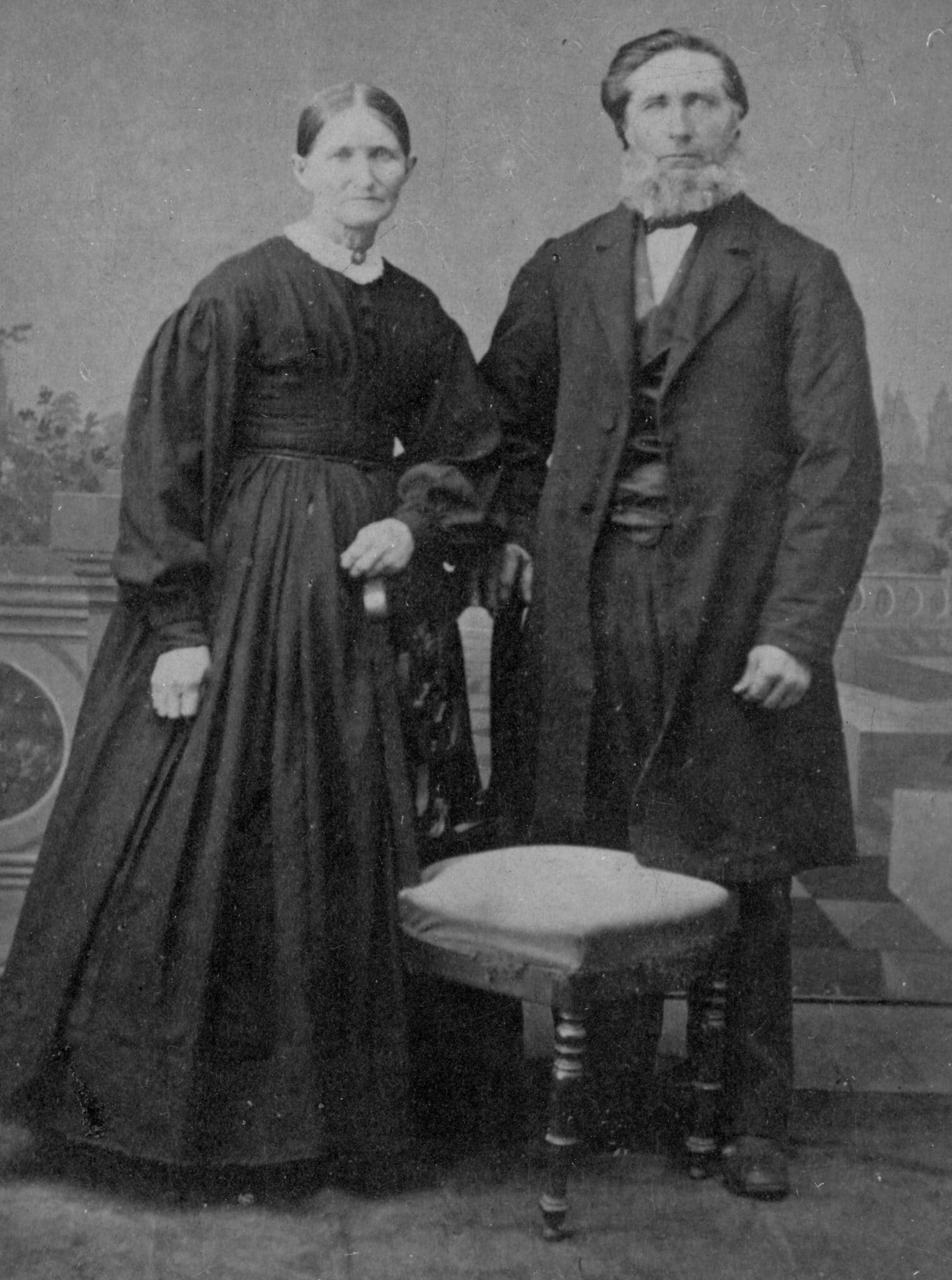This is a photograph of Mr. and Mrs. John Barry. John came to Muscatine in 1847. He was born near Dayton, Ohio November 18, 1840 and died March 9, 1922. He was a Civil War veteran. Their marriage occurred May 3, 1871. Mrs. Barry was the former Miss Mary Frances Nisly. She was born June 29, 1851 and died April 19, 1923. Her parents were Mr. and Mrs. J.R. Nisly.