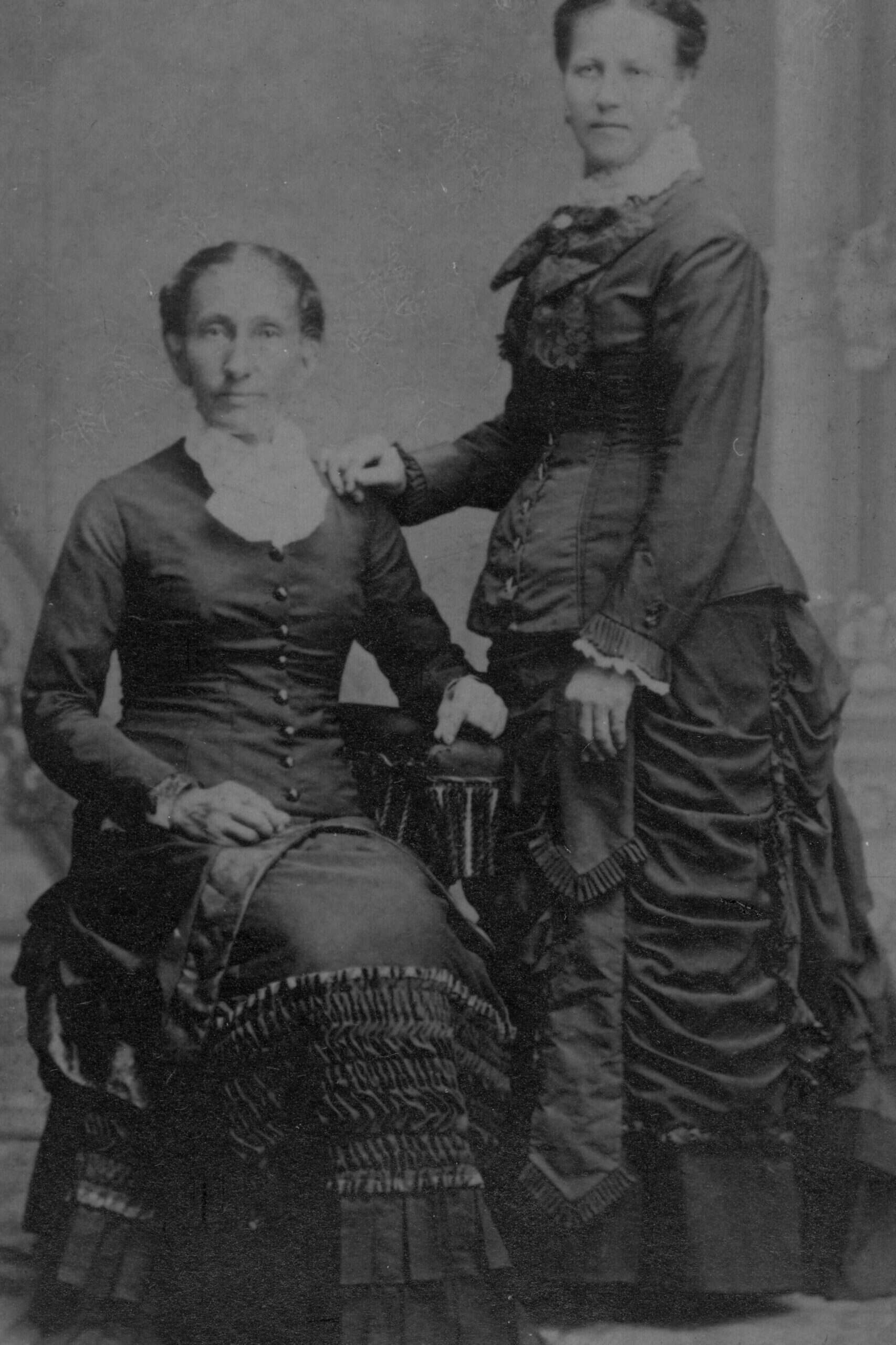 Mrs. Jacob Altekruse, nee Margaret Beckermann, was born in 1825 in Germany. She died April 28, 1914. Her husband Jacob came to Muscatine in 1847. He died in 1860. Mrs. Altekruse is shown in this photograph with her son Gus. Gus was born in St. Louis and is deceased. Gus served in the Civil War.