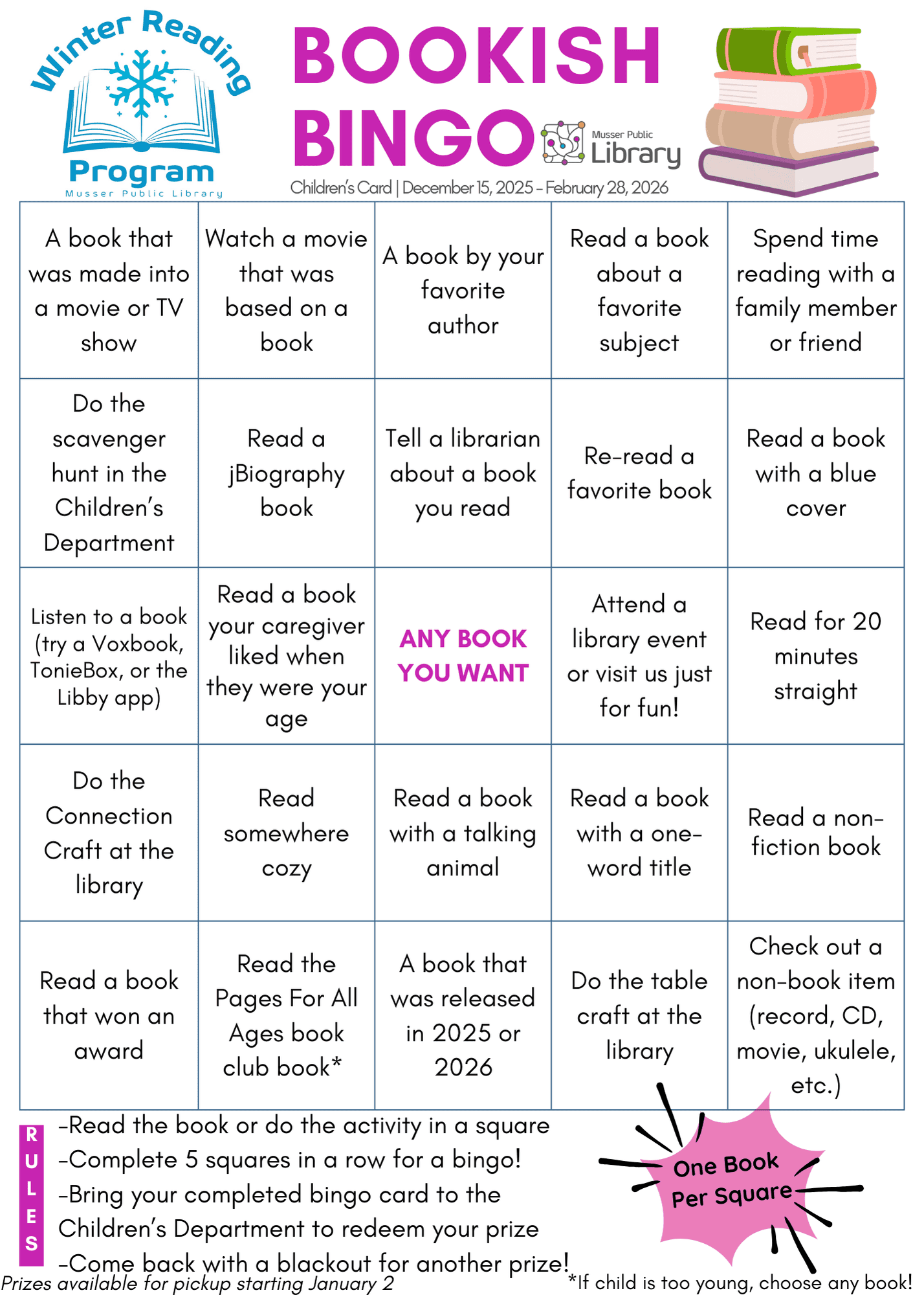 Get ready to cozy up and turn pages because the Musser Public Library’s spectacular Winter Reading Program is officially underway! From now until February 28, your reading adventures can lead to a Bingo and awesome prizes.